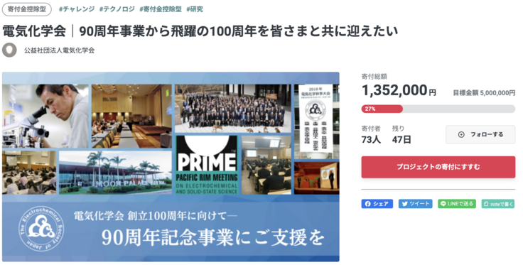 現在73名の方から、1,352,000円のご寄附を頂いております。多くの皆さまからご賛同をいただき、電気化学会一同、大変嬉しく心から感謝申し上げます。