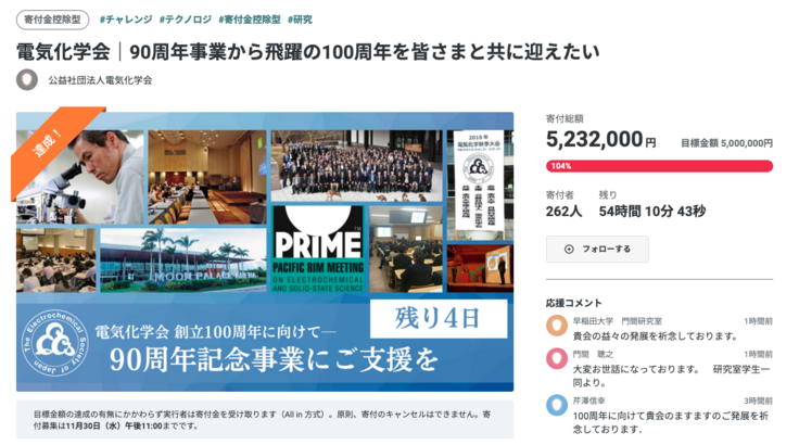 クラウドファンディングは残り2日間です。残りの短い期間にはなりますが、ぜひ皆様の周りで電気化学会のことを話題にしていただき、少しでも多くの方にご興味を持っていただければと思っております。