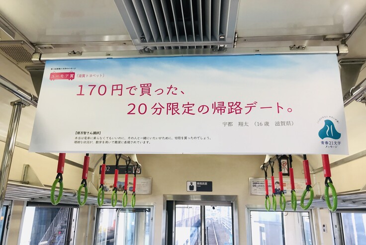 だれかれとなく出てきたそんな言葉から、「青春21文字のメッセージ」は生まれました。「21」は石坂線の駅数に因んでいます