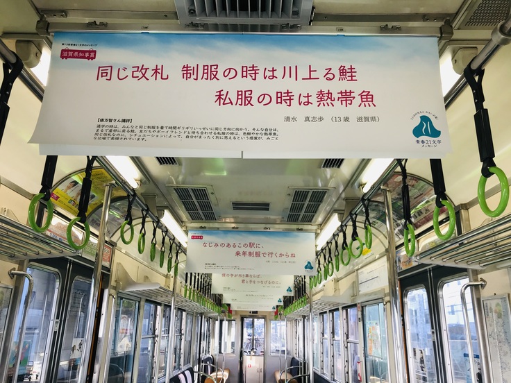 琵琶湖に沿うように滋賀県大津市の中心部を走る京阪電車石坂線(石山坂本線)。沿線には学校が多く、朝夕には制服姿の中高生であふれます。「石坂線って青春っぽい」。だれかれとなく出てきたそんな言葉から、「青春21文字のメッセージ」は生まれました。
