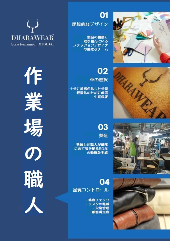 ダラビの優秀な本革ジャケット職人が環境ガイドラインに基づいて、商品の製造を行っています。これらの本革ジャケットを応援購入していただき、インドのムンバイのスラム街:ダラビの復活を応援していただきたいです。