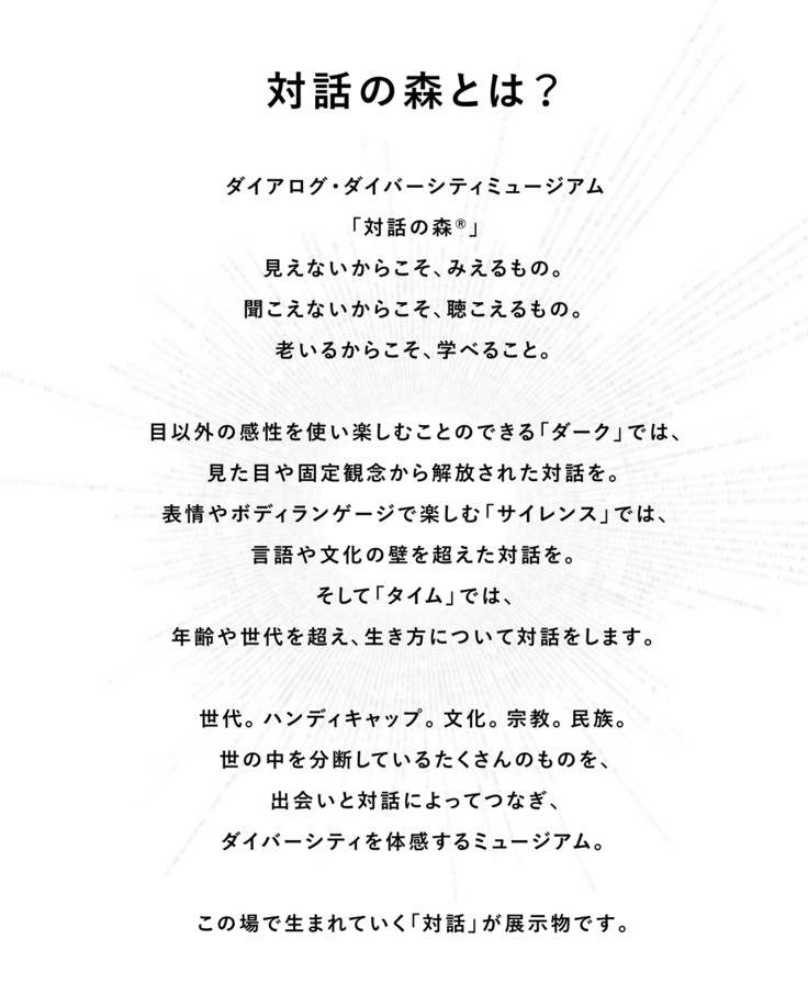 お互いを認め、尊重する対話の力を活かしたソーシャルエンターテイメント「ダイアログ・イン・ザ・ダーク」「ダイアログ・イン・サイレンス」「ダイアログ・ウィズ・タイム」を主催しています。2020年8月、ダイバーシティを体感できる日本初のダイアログ・ダイバーシティミュージアム「対話の森」をオープン。対話を通じて社会が変わるきっかけを生み出すために、更なるチャレンジを進めています! ※日本国内での「ダイアログ・イン・ザ・ダーク」「ダイアログ・イン・サイレンス」「ダイアログ・ウィズ・タイム」のプログラム実施及び商標使用について、一般社団法人ダイアローグ・ジャパン・ソサエティは日本で唯一、ドイツ本部(Dialogue Social Enterprise GmbH)と専属的にライセンス契約を締結しております。