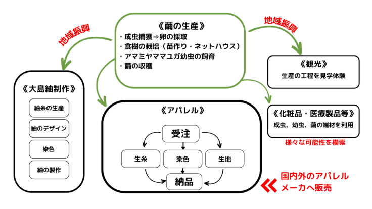 私たちは天蚕(てんさん)という手法で奄美の固有種のアマミヤママユガからシルクを作り、地元の方々と手を携え、まずは地元特産品である大島紬制作を行います。そして生産量増加とともに事業を拡大し高品質なアパレル製品の制作やシルク成分を化粧品や医薬品に利用する等様々な可能性を考えています。