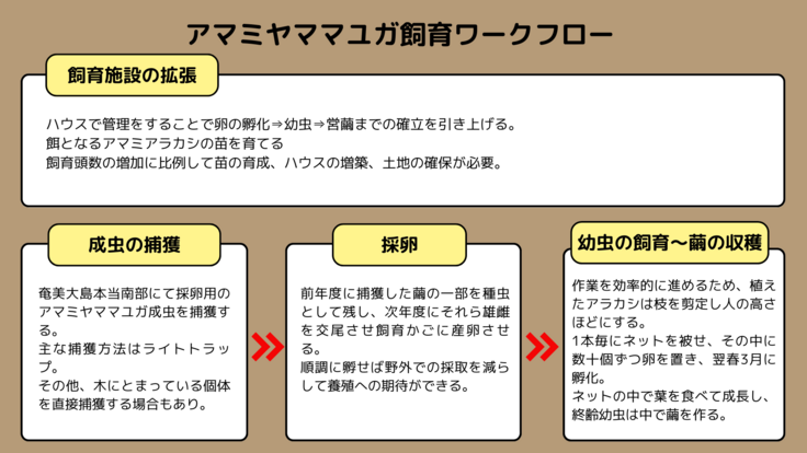 野生のヤママユガを捕獲、交配し卵を採取し、翌年卵を食樹であるアマミアラカシの木に付け幼虫を育て繭にします。