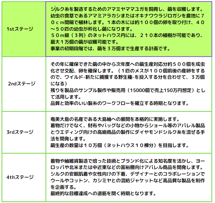 また、単にシルクを生産・販売するだけではなく、生産過程を観光農園として公開し世界自然遺産にも認定された奄美大島の自然や魅力を広く伝える役割を担い、奄美大島の知名度向上や事業の拡大とともに雇用を増やすなど島への貢献することも大きな目標です。