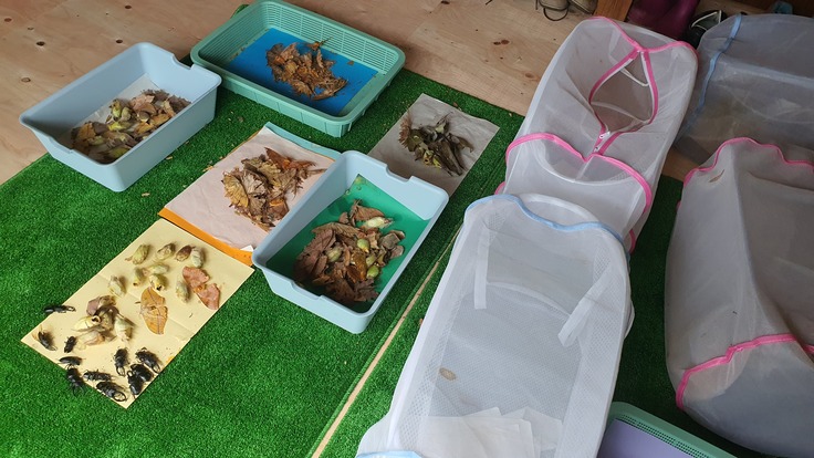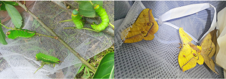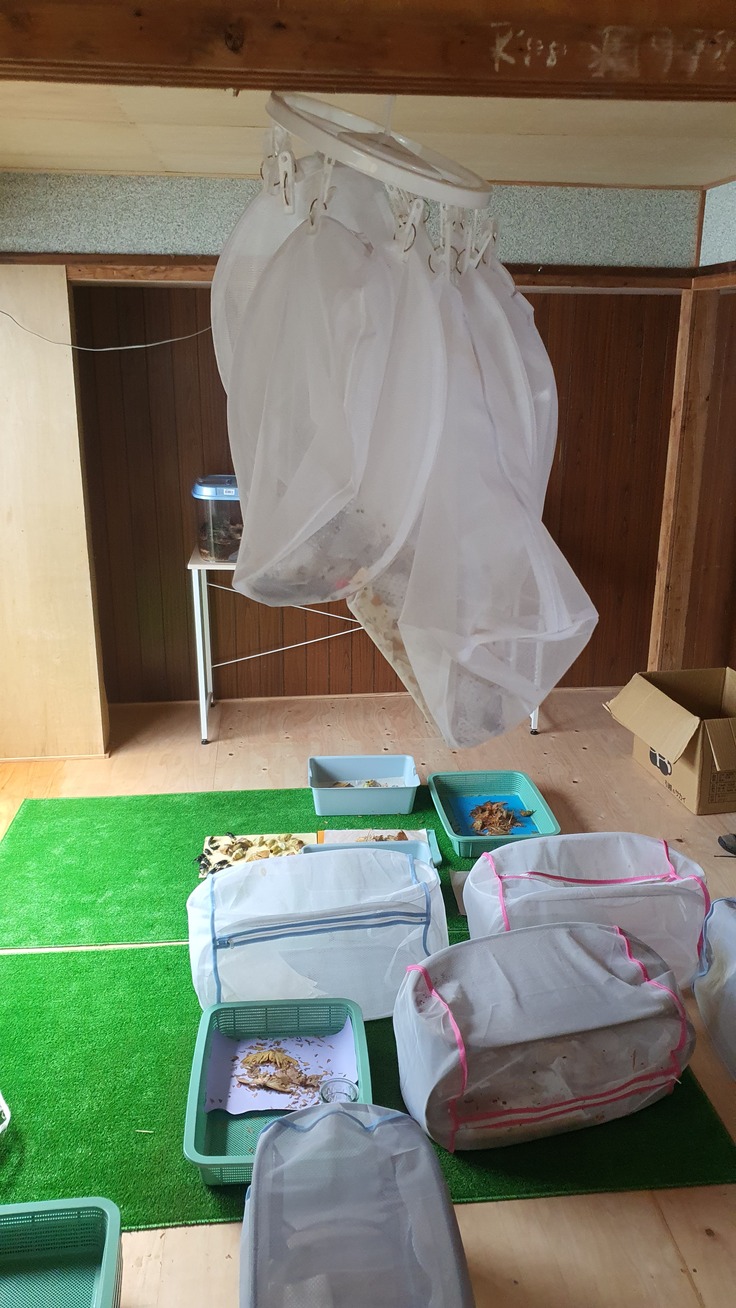 2021年からは卵を屋外の食樹に付けた枝をネットなどで覆って飼育をしてまいりましたが、野鳥やトカゲ等の外敵による捕食や卵寄生蜂による被害、その他ネットから這い出して逃げてしまう個体も多くいるため、卵から大切に育てた幼虫を失い生産量が減ってしまいます。