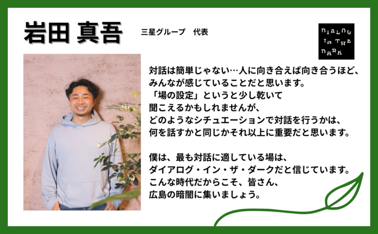 対話は簡単じゃない…人に向き合えば向き合うほど、みんなが感じていることだと思います。「場の設定」というと少し乾いて聞こえるかもしれませんが、どのようなシチュエーションで対話を行うかは、何を話すかと同じかそれ以上に重要だと思います。僕は、最も対話に適している場は、ダイアログ・イン・ザ・ダークだと信じています。こんな時代だからこそ、皆さん、広島の暗闇に集いましょう。