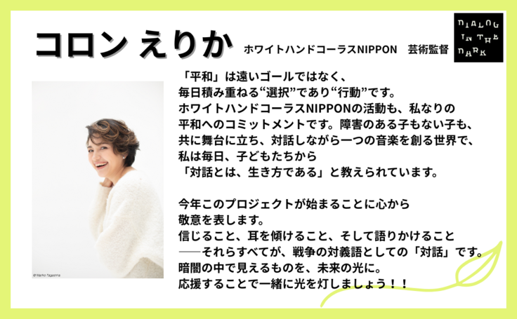 続いて、ホワイトハンドコーラスNIPPON 芸術監督のコロンえりか様より届いたメッセージをご紹介いたします。