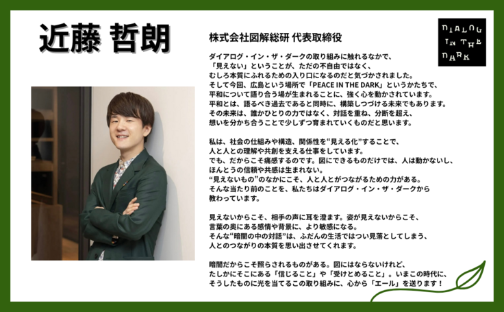 その後、ダイアログ・イン・ザ・ダークの取り組みに触れるなかで、「見えない」ということが、ただの不自由ではなく、むしろ本質にふれるための入り口になるのだと気づかされました。そして今回、広島という場所で「PEACE IN THE DARK」というかたちで、平和について語り合う場が生まれることに、強く心を動かされています。