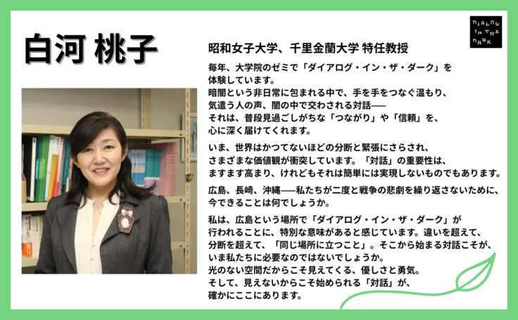 私は、広島という場所で「ダイアログ・イン・ザ・ダーク」が行われることに、特別な意味があると感じています。違いを超えて、分断を超えて、「同じ場所に立つこと」。そこから始まる対話こそが、いま私たちに必要なのではないでしょうか。