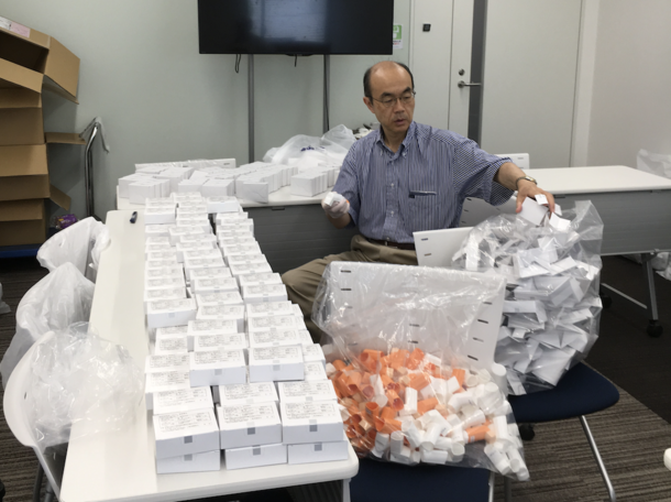 従いまして、共同研究施設に試験用の薬剤をお送りしたときの使用期限は大体1年半くらいになっています。2015年11月に開始したDIFTOスタディですが、2017年の夏には、早くも最初の薬剤の期限を迎え、それらを大量に廃棄しました。この写真はその時の様子を撮影して頂いたものです。