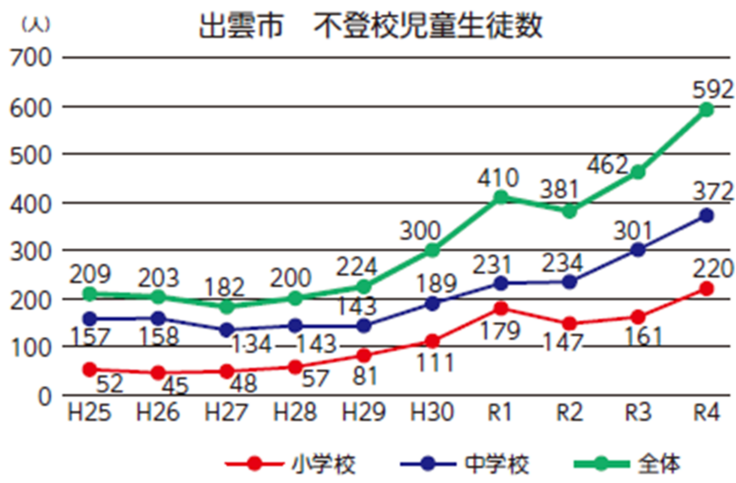 出雲市でも、独自施策を展開するもR4年度の不登校児童生徒数は小・中学校あわせて592人とこちらも過去最多。不登校の理由も多様化しており、増加の一途を辿っています。