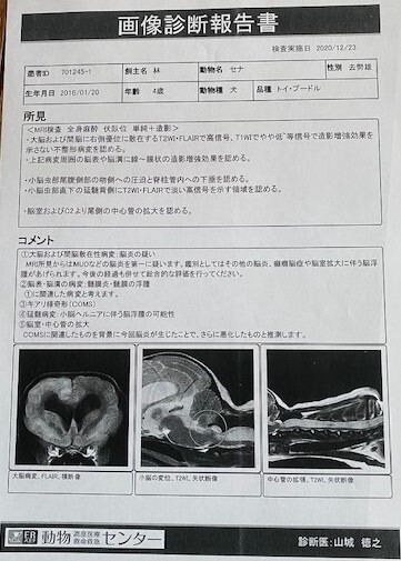 突然激しい発作を起こすようになりました。病院でMRIを撮って検査をした結果、重度の水頭症・骨髄空洞症が発覚、右脳に白い影が広がっていることから脳炎も併発していることが判明したのです。