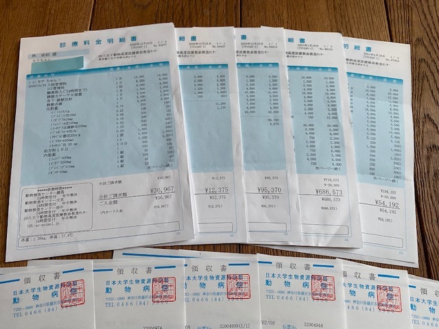 これまでいくつもの病院で治療をしていただきましたが、これまでの長期入院や度重なるMRI・CTでの検査、タップテストの手術に伴い、アニコムの保険の適用回数もここ2ヶ月ほどでほぼ使い切ってしまいました。(アニコム保険では1年の間に使用できる回数に制限があります。その回数の中で、入院費や手術費の一部が返ってきます)