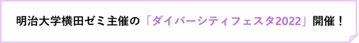 明治大学横田ゼミナールが、明治大学中野キャンパスにてダイバーシティ推進のための「Diversity Festa 2022」を開催します。 集まった資金は、ヒューマンライブラリー運営費60000円、暗闇カフェ運営費35000円、広報費40000円、手話通訳50000円、大学祭参加費9000円、ピープルデザイン就労体験40000円、その他35000円に使用します。