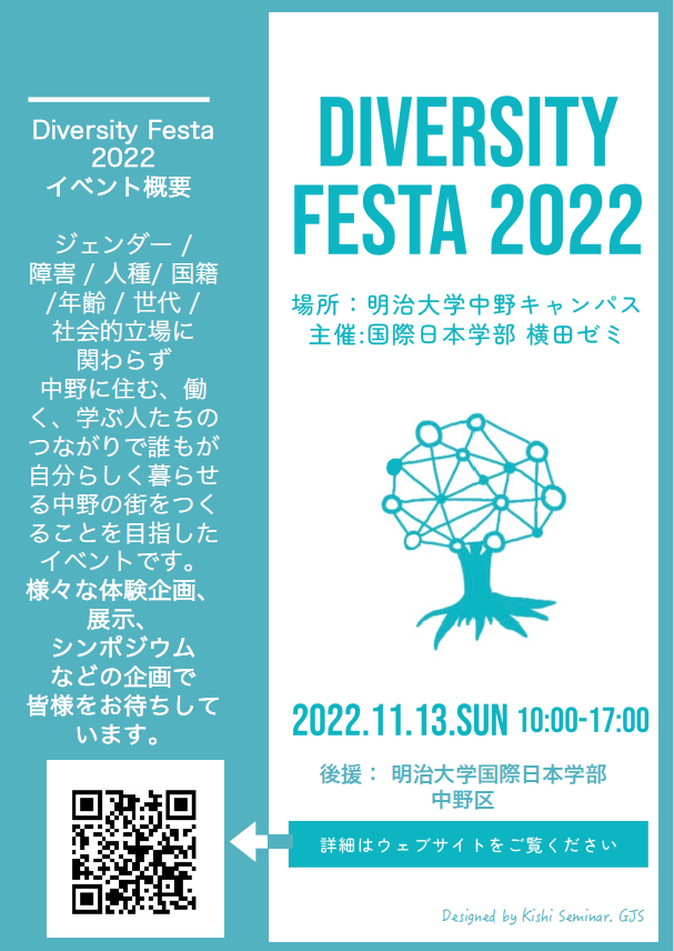 明治大学国際日本学部横田ゼミ11期生です! 過去には10年間ヒューマンライブラリーというイベントを開催してきました。 今年は、ダイバーシティフェスタ2022を開催します! 今後、本イベントが中野区のダイバーシティ推進のための基盤となるよう頑張ります~!