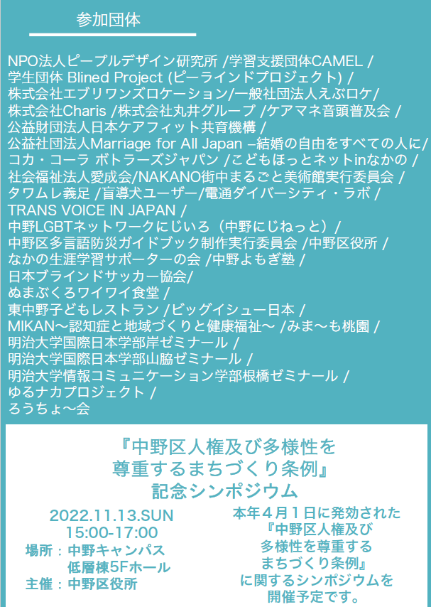 ・条例実質化企画:「本年4月1日に発効された『中野区人権及び多様性を尊重するまちづくり条例』記念シンポジウム」を開催します。
