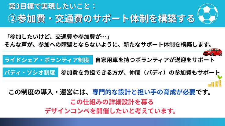 今回の第三目標では、「新しい居場所」の維持継続のための仕組みづくりをご提案させていただきました。これを動かしていくには、新たに多くの人財が必要になります。事業を進めていく仲間になってくださる方に出会うために、「仲間はずれを生み出さないスポーツの居場所」の価値を直接お伝えする機会がとても重要になります。