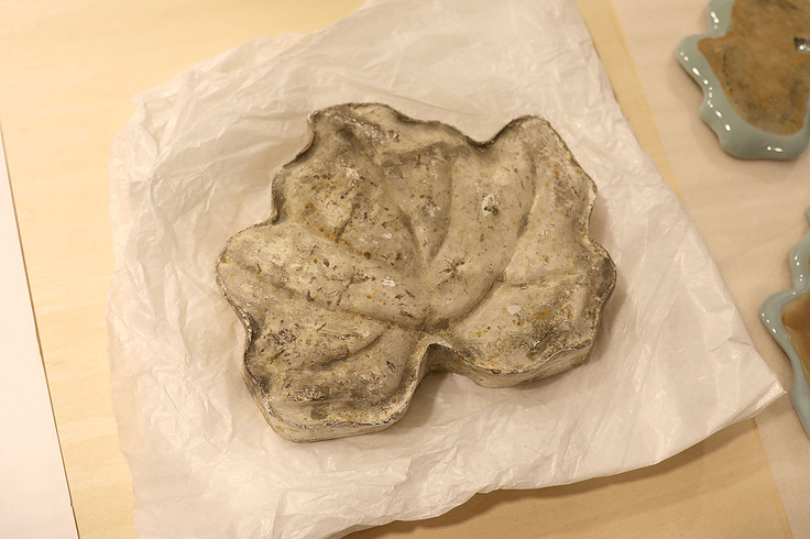 右手の上下二つの葉っぱ模様の置物は、いずれも復元した石膏型です。