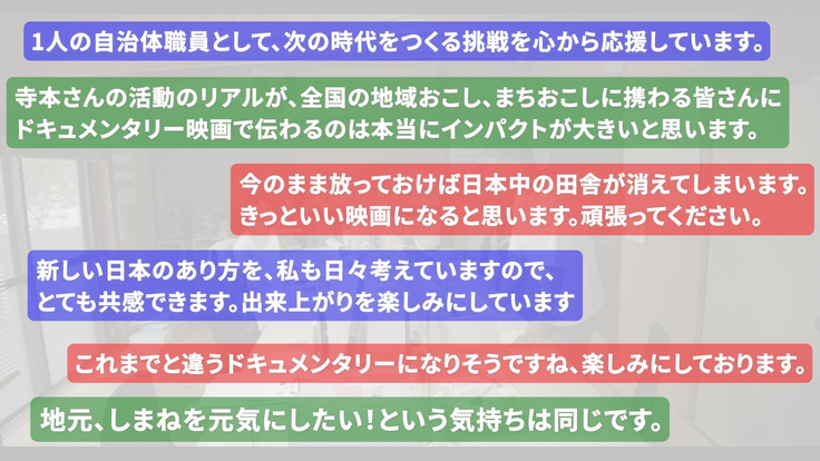 この映画に期待することは、寺本さんの生き方を通して、一歩踏み出し事を起こすことが、自分にとっても地域にとっても可能性を広げ、それが新しい価値を生み出すことにつながっていくことを多くの人に伝えて欲しいということです。その感動を皆さんと分かち合えるよう、今回のチャレンジへのご協力をお願いします」