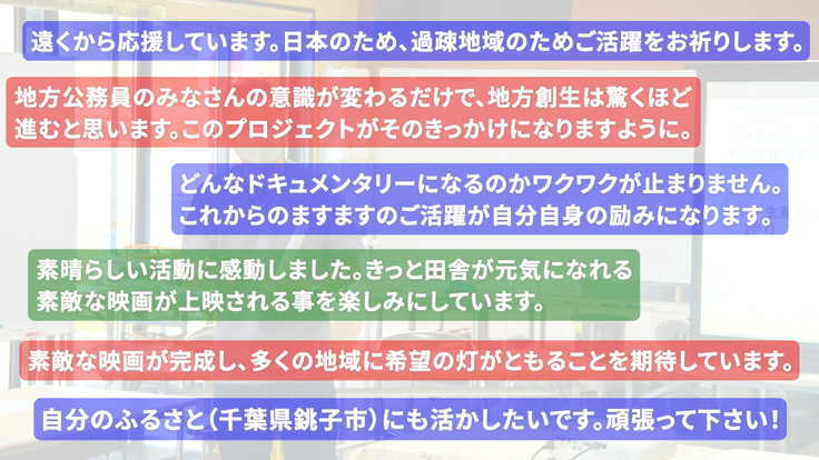 日本国内だけでなく、”地方創生先進国”である日本の現状を海外にもお知らせすべく、映画制作をしておりますので、なにとぞ応援のほどよろしくお願いします。