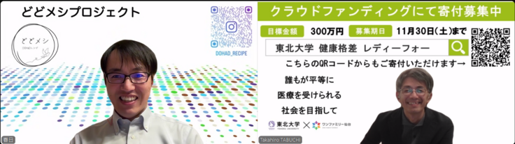 お話を伺っていて、どどメシプロジェクトで扱うレシピは安く美味しく、そして健康的なレシピなので、きっと田淵先生たちのプロジェクトでも役に立つはず!と勝手に思いました!そして、お互いの支援の輪が広がっていくことを期待してしまいました。