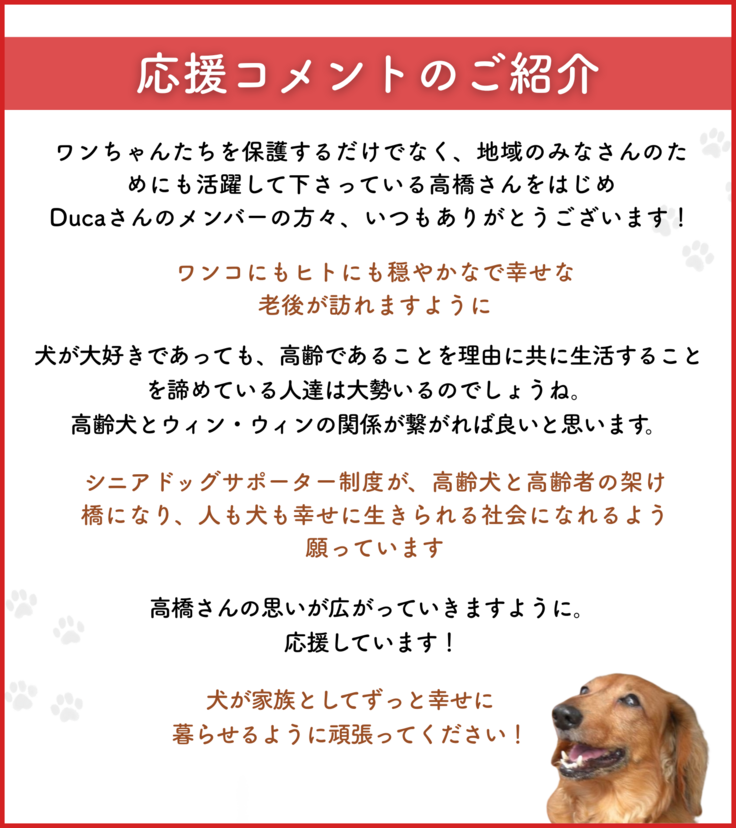昨日、ネクストゴールを達成し、現在は残り少ない時間ではありますが、サードゴールを目指して、より多くの人にDOG DUCAの取り組みを、シニアドッグ・サポーター制度を、高齢者と高齢犬が日本で置かれている現状を、皆様に知ってもらうべく、拡散をお願いしております。