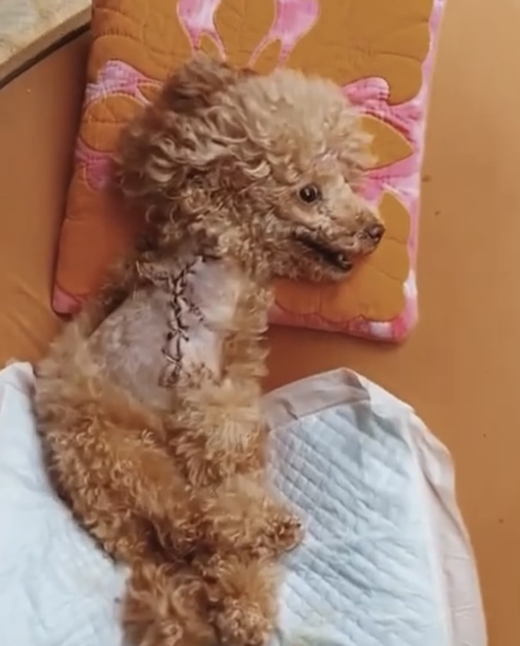 繁殖犬としてやっと仕事を終えた後、こんな身体になってしまい、彼女も自分自身に何が起きているのかわからない様子でした。