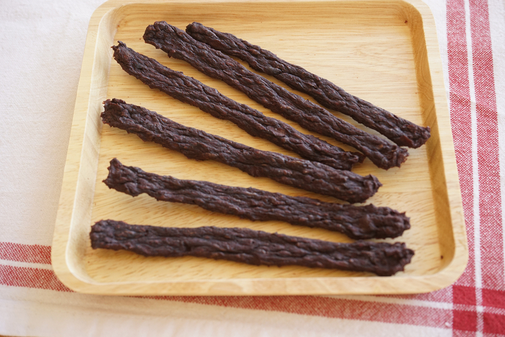 次に、鹿肉のミンチとさつまいもを蒸かしたものを混ぜ合わせ、スティック状に乾燥させて、好きな大きさに折れるおやつも作ってみました。