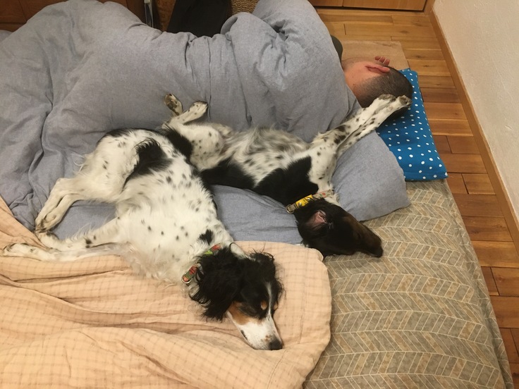 ブリタニー・スパニエルという中型の鳥猟犬です。日本ではあまり見かけませんが、海外ではメジャーな家庭犬とされています。ドロボウより猪や狸・アライグマのイタズラ避けのためと「夫の癒やしのため」が本当の理由です。