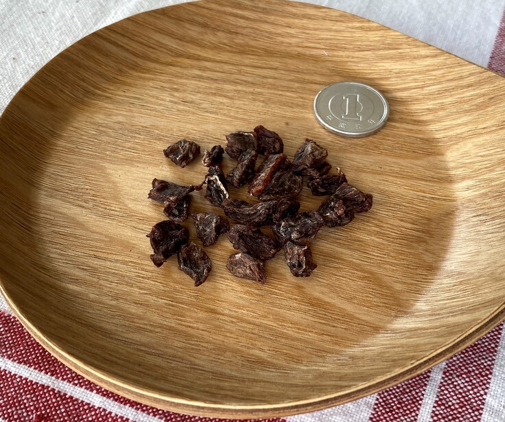 そこで、鹿肉を小指の先ほどの大きさに切り出し、乾燥させてみました。思った通り、スムーズにトレーニングできました。