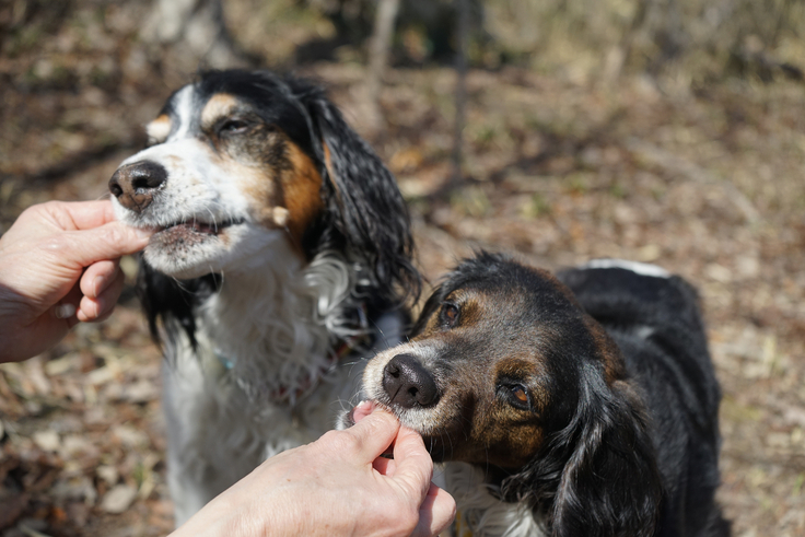 予め、おやつのジャーキーやクッキーなどを小さくして準備しておくのですが、あっという間になくなりますし、その場でちぎってやってもスピードが・・・