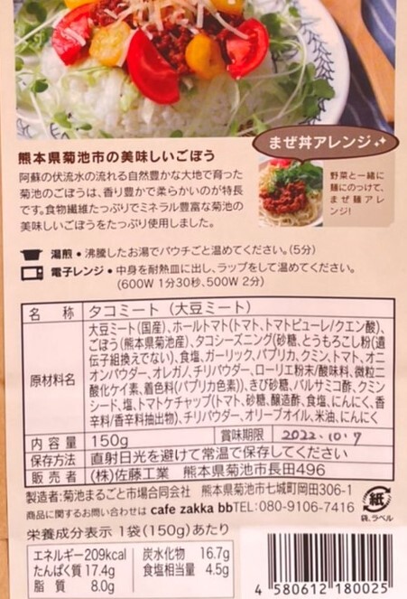 「きくちごぼタコミート」と「きくちごぼビビーンバ」は、大豆ミートを使用しています。