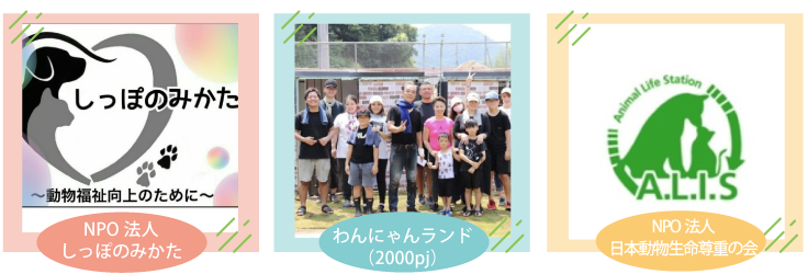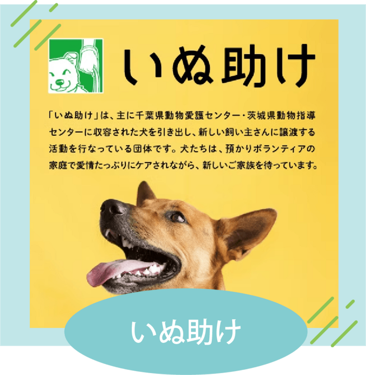 活動内容:千葉県動物愛護センター・茨城県動物指導センターに収容された犬を引き出し、新しい飼い主さんに譲渡する活動を行っています。シェルター等の施設を持たず、ボランティアのみで活動されています。