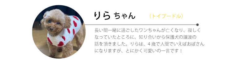 今回、ペットフードでの寄付の話を聞いて、うれしくなりました!&Youさんのペットフードは、本当に美味しいらしく、りらがいつも喜んでいるので♪素材だけの味なので、私も安心して食べさせています。どうか保護犬・保護猫ちゃんたちにもこの美味しさを味わってもらいたいです。