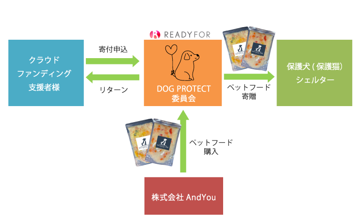 皆さまからいただいた資金をもとに、販売者:ペットフード製造許可を有する「株式会社AndYou」(製造業者:株式会社ウォームブランケット)から購入した商品(市販品)を開封・詰め替えなどせずにそのまま寄贈先へ送付いたします。