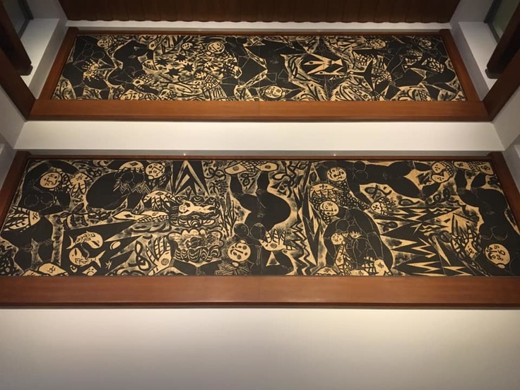 特筆すべきはロビーの棟方志功。開業時に合わせてオーナーが直々に依頼したそうですが、棟方志功作品の中では最大級。写真で見ても、すごい迫力ですね。版画でやりたくないという作者に、いや、版画でないとダメだという大原家との押し問答もあったとか...