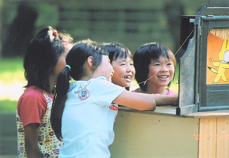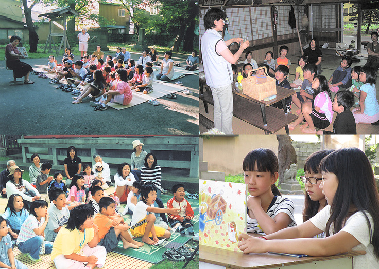 青森県五所川原市元町の八幡宮境内で、毎年夏休みの期間中に「子どもの森読書会」が開かれています。朝6時から、ラジオ体操に始まり、お話や絵本の読み聞かせ、紙芝居の発表、工作、ゲーム、本の貸し出しなどを行っています。活動は、町内会・神社総代会・図書館・小学校などの支援を受け、ボランティアの世話人会〈代表・岩崎繁芳(五所川原市元町33-2)、ほとんどが男性です〉を中心に、教員や読み聞かせグループなどの協力で続けてきました。