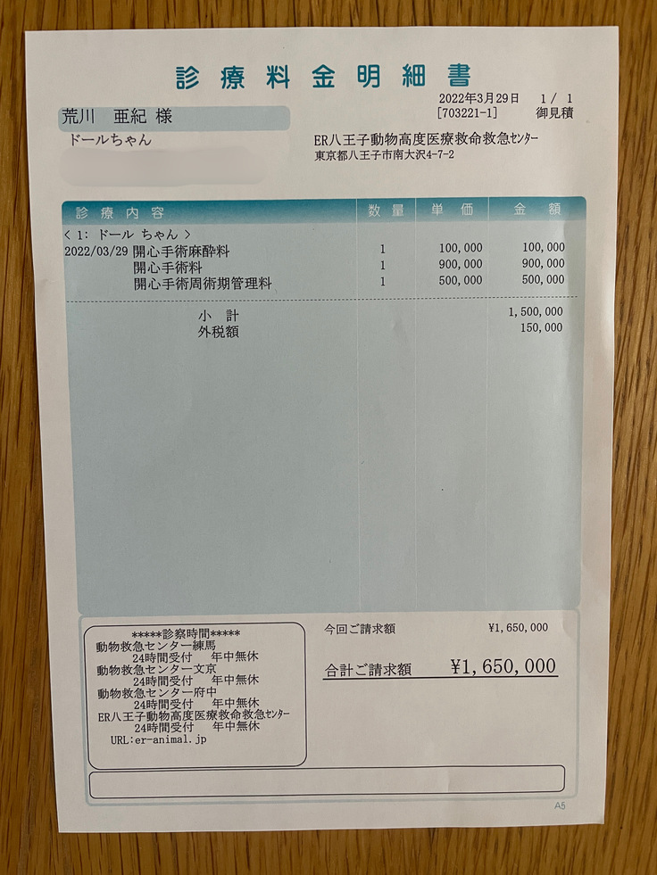 愛犬のドールの僧帽弁閉鎖不全症の手術費用