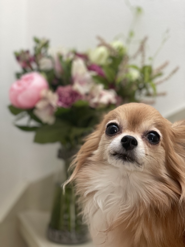 綺麗なお花をいただき、ポーズをとるドールの写真です。