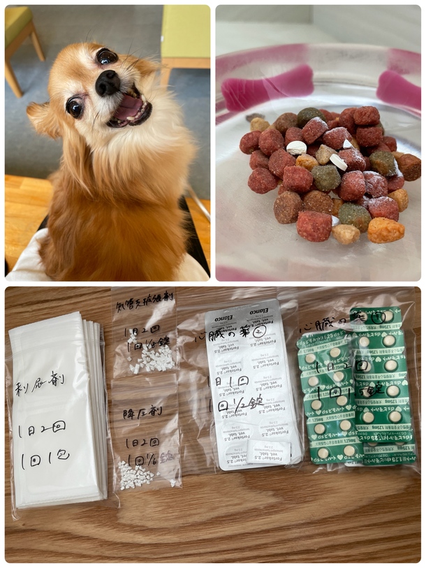 心臓のお薬2種類(ピモハート.フォルテコール)と、気管支拡張剤(ネオフィリン)利尿剤(ラプラック)と降圧剤(アムロジピン)5種類です。