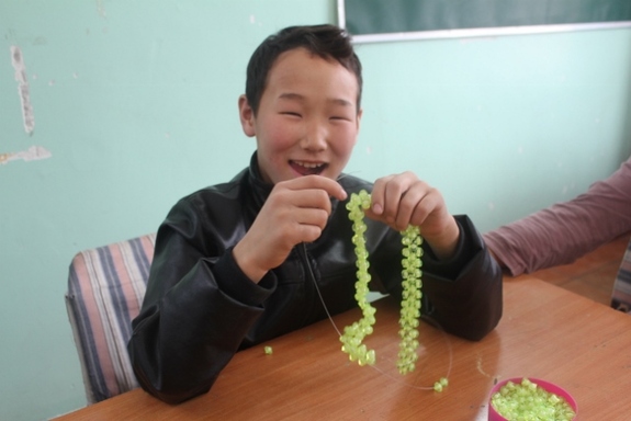 『モンゴルではよく、馬の絵や動物の絵を飾る習慣があるけど、日本は違うから、ビーズの小物入れの方が喜ばれると思うな」と答えると、トゥムルーは、子どもたちを集めてビーズの小物入れのレッスンを始めました。』」