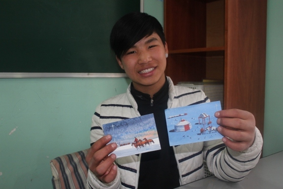 絵が得意なバーサンフーが、リーダーとなって、モンゴルらしいゲルや馬の絵などを準備しております。