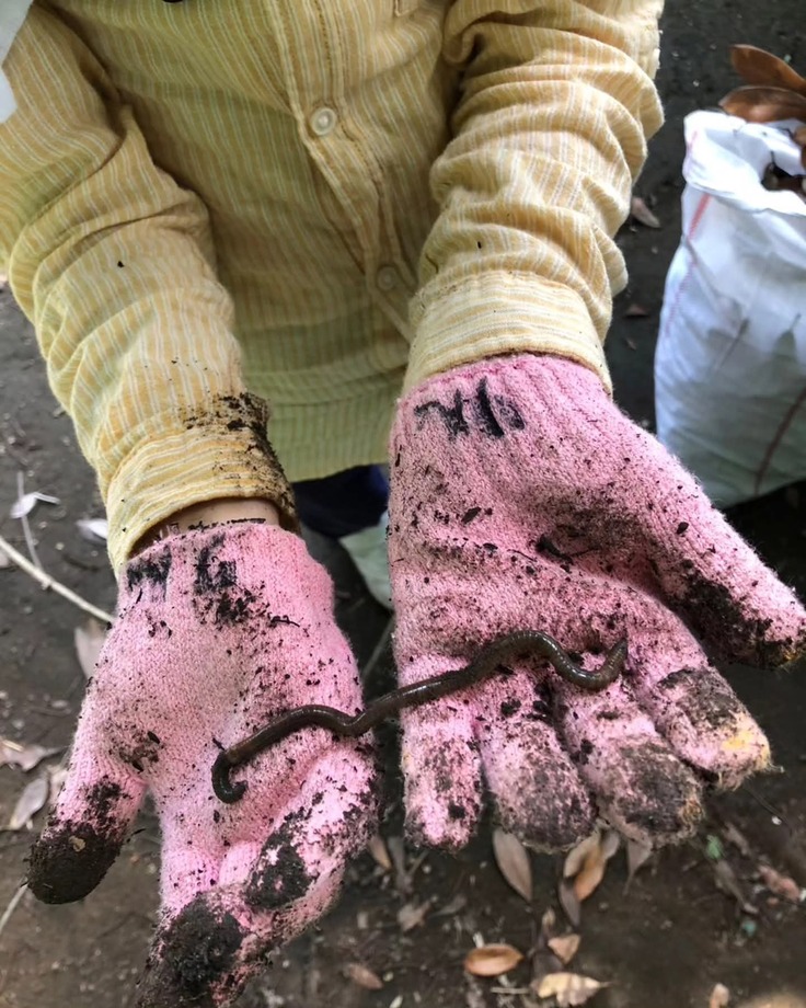 大きなミミズに遭遇。ミミズが豊かな森をつくってくれます。