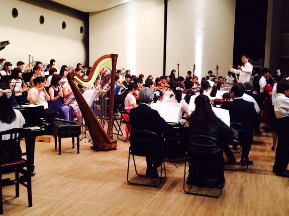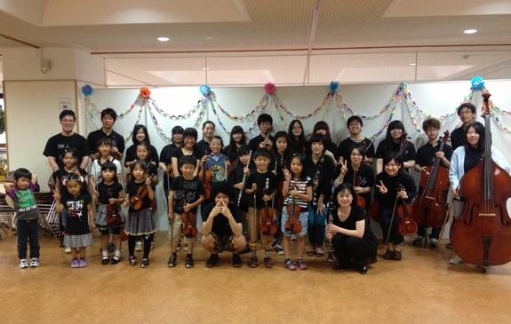 (北海道内、群馬県、埼玉県、タイ、香港、チェコからもメンバーが集まり子どもから大人まで総勢130名が参加。2014年8月 第1回日本少年少女オーケストラフェスティバルin北海道 於・江別市民会館大ホール)