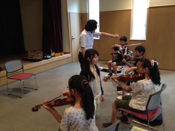 (2013年7月 江別ジュニアオーケストラ設立に向けた、ヴァイオリン体験会の様子 講師は南紳一先生他 於・江別インターナショナルスクール)