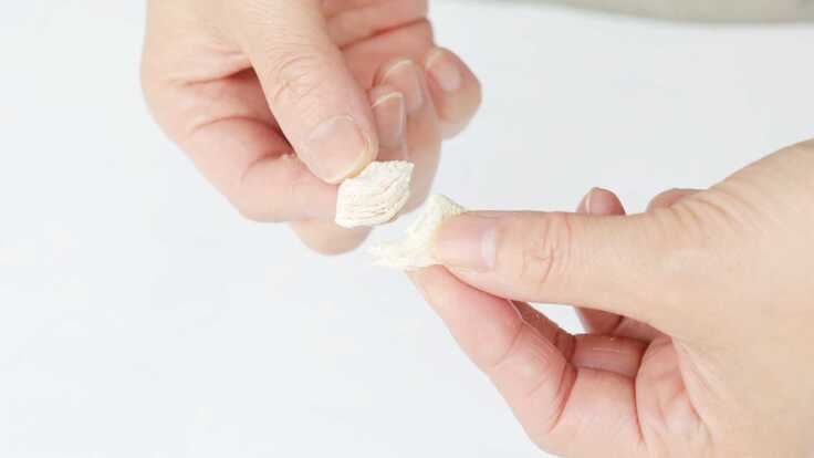 一度火を通した仔牛肉をフリーズドライ技術で乾燥させることで、肉の栄養素を損なうことなく、美味しさをそのまま閉じ込めます。そのままサクサクと、水で戻せばしっとりとした蒸し牛肉のような食感を楽しめるはず!