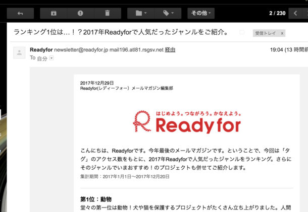 Readyfor今年最後のメルマガのトップに掲載されました!