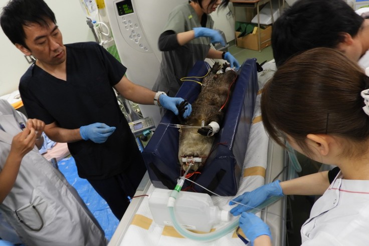 その病態を詳しく評価し、今後の治療方針について検討するため、岩手大学において、動物園水族館動物医療チーム(未来を創るどうぶつ医師団の前身)の協力の下、他施設の獣医師も駆けつけ、協働診療を行いました。