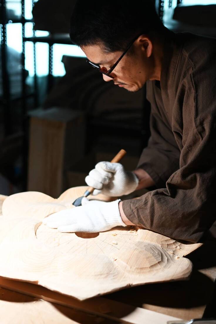 現在は、台座の荒彫りの作業を進めており、その彫刻が完成次第、古式彩色を施します。